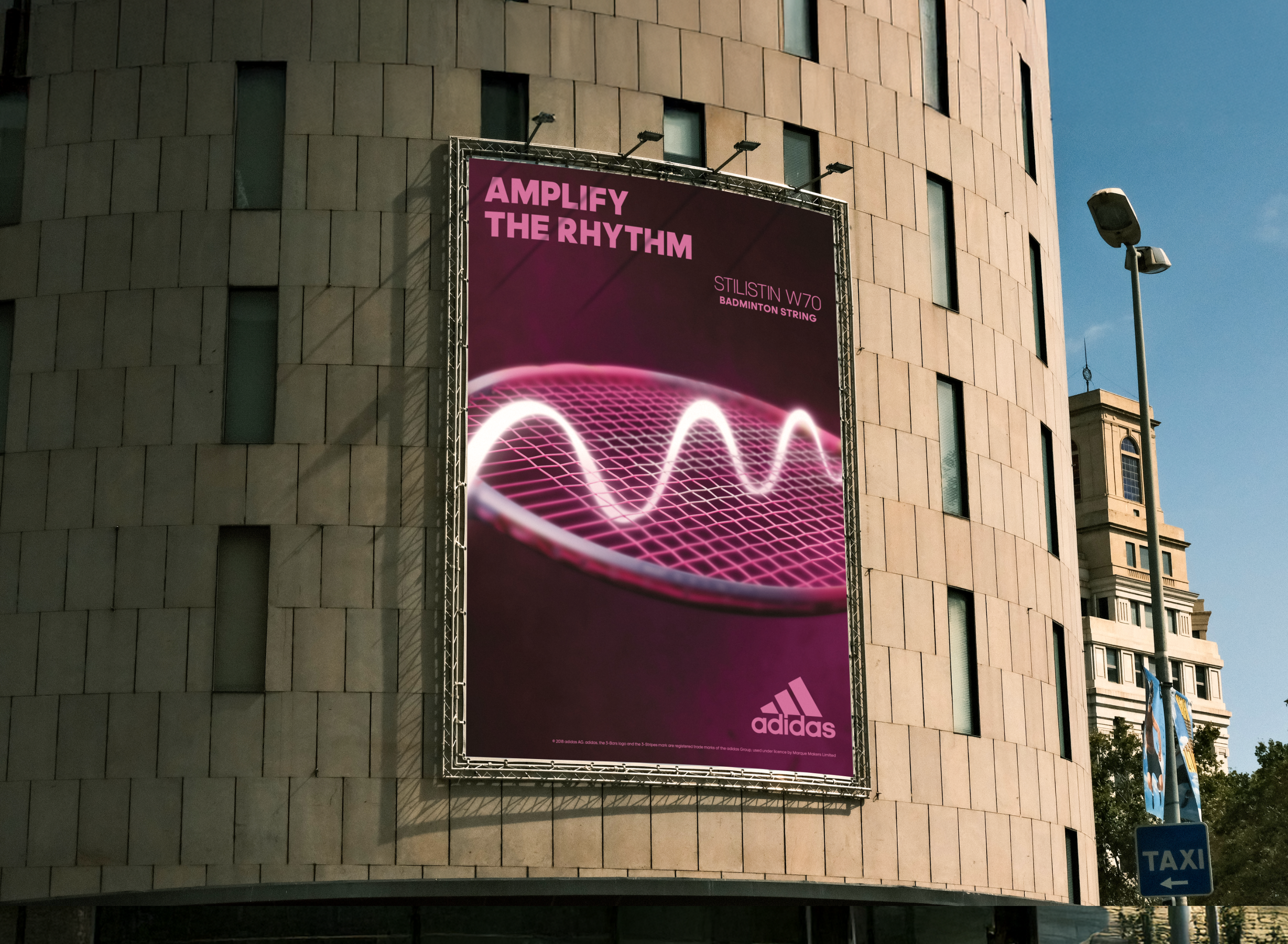 The Adidas Stilistin W70 badminton string, crafted for female players, embodies the tagline "Amplify the Rhythm." Its lightweight and flexible design delivers a soft, comfortable feel, ensuring handy control and a smooth hitting experience. That’s why I created a dynamic, flowing line to visualize the string’s vibrant frequency, capturing its lively and responsive essence. The Stilistin W70 empowers women to play with ease and rhythm, blending style and comfort.